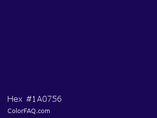 Hex #1a0756 Color is a very dark indigo color and the nearest color is Cherry Pie #2a0359. Hex code #1a0756 and RGB value is rgb(26,7,86). In RGB color space, this color is composed of 10% red, 3% green, 34% blue, In CMYK color space, this color is composed of 70% cyan, 92% magenta, 0% yellow , 66% black , In HSL color space, this color has a hue angle of 254° , 85% saturation and 18% lightness.