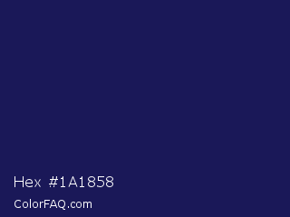 Hex #1a1858 Color is a very dark indigo color and the nearest color is Bunting #151f4c. Hex code #1a1858 and RGB value is rgb(26,24,88). In RGB color space, this color is composed of 10% red, 9% green, 35% blue, In CMYK color space, this color is composed of 70% cyan, 73% magenta, 0% yellow , 65% black , In HSL color space, this color has a hue angle of 242° , 57% saturation and 22% lightness.