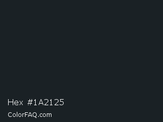 Hex #1a2125 Color is a very dark blue color and the nearest color is Dark Jungle Green #1a2421. Hex code #1a2125 and RGB value is rgb(26,33,37). In RGB color space, this color is composed of 10% red, 13% green, 15% blue, In CMYK color space, this color is composed of 30% cyan, 11% magenta, 0% yellow , 85% black , In HSL color space, this color has a hue angle of 202° , 17% saturation and 12% lightness.