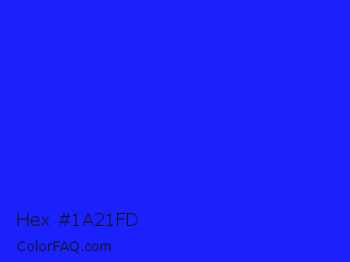 Hex #1a21fd Color is a normal blue color and the nearest color is Bluebonnet #1c1cf0. Hex code #1a21fd and RGB value is rgb(26,33,253). In RGB color space, this color is composed of 10% red, 13% green, 99% blue, In CMYK color space, this color is composed of 90% cyan, 87% magenta, 0% yellow , 1% black , In HSL color space, this color has a hue angle of 238° , 98% saturation and 55% lightness.
