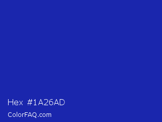 Hex #1a26ad Color is a normal blue color and the nearest color is Egyptian Blue #1034a6. Hex code #1a26ad and RGB value is rgb(26,38,173). In RGB color space, this color is composed of 10% red, 15% green, 68% blue, In CMYK color space, this color is composed of 85% cyan, 78% magenta, 0% yellow , 32% black , In HSL color space, this color has a hue angle of 235° , 74% saturation and 39% lightness.