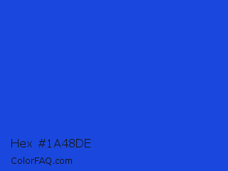 Hex #1a48de Color is a normal blue color and the nearest color is Palatinate Blue #273be2. Hex code #1a48de and RGB value is rgb(26,72,222). In RGB color space, this color is composed of 10% red, 28% green, 87% blue, In CMYK color space, this color is composed of 88% cyan, 68% magenta, 0% yellow , 13% black , In HSL color space, this color has a hue angle of 226° , 79% saturation and 49% lightness.