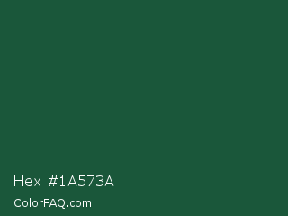 Hex #1a573a Color is a very dark green color and the nearest color is Brunswick Green #1b4d3e. Hex code #1a573a and RGB value is rgb(26,87,58). In RGB color space, this color is composed of 10% red, 34% green, 23% blue, In CMYK color space, this color is composed of 70% cyan, 0% magenta, 33% yellow , 66% black , In HSL color space, this color has a hue angle of 151° , 54% saturation and 22% lightness.
