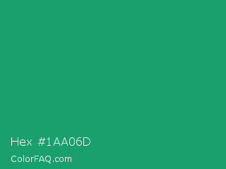 Hex #1aa06d Color is a normal green color and the nearest color is Green Crayola #1cac78. Hex code #1aa06d and RGB value is rgb(26,160,109). In RGB color space, this color is composed of 10% red, 63% green, 43% blue, In CMYK color space, this color is composed of 84% cyan, 0% magenta, 32% yellow , 37% black , In HSL color space, this color has a hue angle of 157° , 72% saturation and 36% lightness.