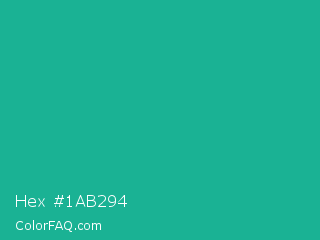 Hex #1ab294 Color is a normal cyan color and the nearest color is Mountain Meadow Crayola #1ab385. Hex code #1ab294 and RGB value is rgb(26,178,148). In RGB color space, this color is composed of 10% red, 70% green, 58% blue, In CMYK color space, this color is composed of 85% cyan, 0% magenta, 17% yellow , 30% black , In HSL color space, this color has a hue angle of 168° , 75% saturation and 40% lightness.