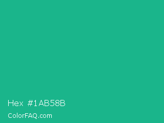 Hex #1ab58b Color is a normal cyan color and the nearest color is Mountain Meadow Crayola #1ab385. Hex code #1ab58b and RGB value is rgb(26,181,139). In RGB color space, this color is composed of 10% red, 71% green, 55% blue, In CMYK color space, this color is composed of 86% cyan, 0% magenta, 23% yellow , 29% black , In HSL color space, this color has a hue angle of 164° , 75% saturation and 41% lightness.