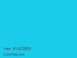 Hex #1acbeb Color is a normal cyan color and the nearest color is Spiro Disco Ball #0fc0fc. Hex code #1acbeb and RGB value is rgb(26,203,235). In RGB color space, this color is composed of 10% red, 80% green, 92% blue, In CMYK color space, this color is composed of 89% cyan, 14% magenta, 0% yellow , 8% black , In HSL color space, this color has a hue angle of 189° , 84% saturation and 51% lightness.