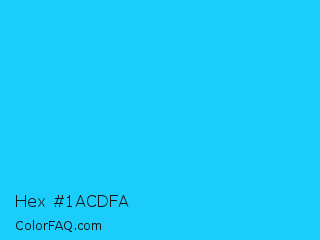 Hex #1acdfa Color is a normal cyan color and the nearest color is Spiro Disco Ball #0fc0fc. Hex code #1acdfa and RGB value is rgb(26,205,250). In RGB color space, this color is composed of 10% red, 80% green, 98% blue, In CMYK color space, this color is composed of 90% cyan, 18% magenta, 0% yellow , 2% black , In HSL color space, this color has a hue angle of 192° , 96% saturation and 54% lightness.