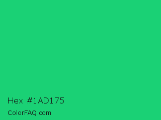 Hex #1ad175 Color is a normal green color and the nearest color is Mountain Meadow Crayola #1ab385. Hex code #1ad175 and RGB value is rgb(26,209,117). In RGB color space, this color is composed of 10% red, 82% green, 46% blue, In CMYK color space, this color is composed of 88% cyan, 0% magenta, 44% yellow , 18% black , In HSL color space, this color has a hue angle of 150° , 78% saturation and 46% lightness.