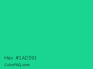 Hex #1ad591 Color is a normal green color and the nearest color is Shamrock #33cc99. Hex code #1ad591 and RGB value is rgb(26,213,145). In RGB color space, this color is composed of 10% red, 84% green, 57% blue, In CMYK color space, this color is composed of 88% cyan, 0% magenta, 32% yellow , 16% black , In HSL color space, this color has a hue angle of 158° , 78% saturation and 47% lightness.