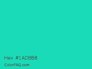 Hex #1adbb8 Color is a normal cyan color and the nearest color is Java #1fc2c2. Hex code #1adbb8 and RGB value is rgb(26,219,184). In RGB color space, this color is composed of 10% red, 86% green, 72% blue, In CMYK color space, this color is composed of 88% cyan, 0% magenta, 16% yellow , 14% black , In HSL color space, this color has a hue angle of 169° , 79% saturation and 48% lightness.