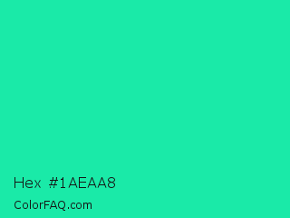 Hex #1aeaa8 Color is a normal green color and the nearest color is Medium Spring Green #00fa9a. Hex code #1aeaa8 and RGB value is rgb(26,234,168). In RGB color space, this color is composed of 10% red, 92% green, 66% blue, In CMYK color space, this color is composed of 89% cyan, 0% magenta, 28% yellow , 8% black , In HSL color space, this color has a hue angle of 161° , 83% saturation and 51% lightness.