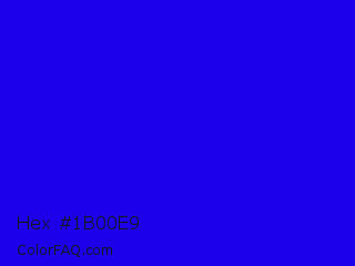 Hex #1b00e9 Color is a normal indigo color and the nearest color is Bluebonnet #1c1cf0. Hex code #1b00e9 and RGB value is rgb(27,0,233). In RGB color space, this color is composed of 11% red, 0% green, 91% blue, In CMYK color space, this color is composed of 88% cyan, 100% magenta, 0% yellow , 9% black , In HSL color space, this color has a hue angle of 247° , 100% saturation and 46% lightness.