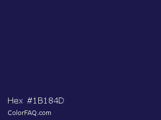 Hex #1b184d Color is a very dark indigo color and the nearest color is Bunting #151f4c. Hex code #1b184d and RGB value is rgb(27,24,77). In RGB color space, this color is composed of 11% red, 9% green, 30% blue, In CMYK color space, this color is composed of 65% cyan, 69% magenta, 0% yellow , 70% black , In HSL color space, this color has a hue angle of 243° , 52% saturation and 20% lightness.