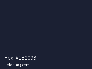 Hex #1b2033 Color is a very dark blue color and the nearest color is Dark Gunmetal #1f262a. Hex code #1b2033 and RGB value is rgb(27,32,51). In RGB color space, this color is composed of 11% red, 13% green, 20% blue, In CMYK color space, this color is composed of 47% cyan, 37% magenta, 0% yellow , 80% black , In HSL color space, this color has a hue angle of 228° , 31% saturation and 15% lightness.