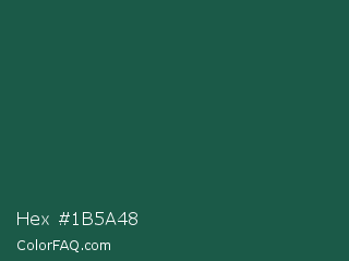 Hex #1b5a48 Color is a dark green color and the nearest color is Green Pea #1d6142. Hex code #1b5a48 and RGB value is rgb(27,90,72). In RGB color space, this color is composed of 11% red, 35% green, 28% blue, In CMYK color space, this color is composed of 70% cyan, 0% magenta, 20% yellow , 65% black , In HSL color space, this color has a hue angle of 163° , 54% saturation and 23% lightness.
