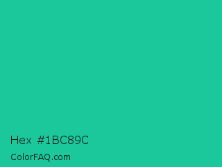 Hex #1bc89c Color is a normal cyan color and the nearest color is Shamrock #33cc99. Hex code #1bc89c and RGB value is rgb(27,200,156). In RGB color space, this color is composed of 11% red, 78% green, 61% blue, In CMYK color space, this color is composed of 87% cyan, 0% magenta, 22% yellow , 22% black , In HSL color space, this color has a hue angle of 165° , 76% saturation and 45% lightness.