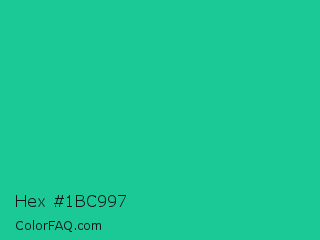 Hex #1bc997 Color is a normal green color and the nearest color is Shamrock #33cc99. Hex code #1bc997 and RGB value is rgb(27,201,151). In RGB color space, this color is composed of 11% red, 79% green, 59% blue, In CMYK color space, this color is composed of 87% cyan, 0% magenta, 25% yellow , 21% black , In HSL color space, this color has a hue angle of 163° , 76% saturation and 45% lightness.