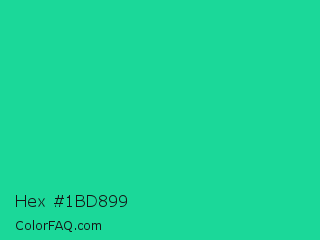 Hex #1bd899 Color is a normal green color and the nearest color is Shamrock #33cc99. Hex code #1bd899 and RGB value is rgb(27,216,153). In RGB color space, this color is composed of 11% red, 85% green, 60% blue, In CMYK color space, this color is composed of 88% cyan, 0% magenta, 29% yellow , 15% black , In HSL color space, this color has a hue angle of 160° , 78% saturation and 48% lightness.