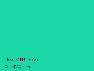 Hex #1bd8a6 Color is a normal cyan color and the nearest color is Shamrock #33cc99. Hex code #1bd8a6 and RGB value is rgb(27,216,166). In RGB color space, this color is composed of 11% red, 85% green, 65% blue, In CMYK color space, this color is composed of 88% cyan, 0% magenta, 23% yellow , 15% black , In HSL color space, this color has a hue angle of 164° , 78% saturation and 48% lightness.