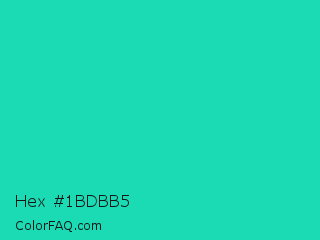 Hex #1bdbb5 Color is a normal cyan color and the nearest color is Java #1fc2c2. Hex code #1bdbb5 and RGB value is rgb(27,219,181). In RGB color space, this color is composed of 11% red, 86% green, 71% blue, In CMYK color space, this color is composed of 88% cyan, 0% magenta, 17% yellow , 14% black , In HSL color space, this color has a hue angle of 168° , 78% saturation and 48% lightness.