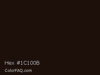 Hex #1c100b Color is a almost black orange color and the nearest color is Crowshead #1c1208. Hex code #1c100b and RGB value is rgb(28,16,11). In RGB color space, this color is composed of 11% red, 6% green, 4% blue, In CMYK color space, this color is composed of 0% cyan, 43% magenta, 61% yellow , 89% black , In HSL color space, this color has a hue angle of 18° , 44% saturation and 8% lightness.