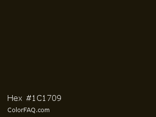 Hex #1c1709 Color is a almost black orange color and the nearest color is El Paso #1e1708. Hex code #1c1709 and RGB value is rgb(28,23,9). In RGB color space, this color is composed of 11% red, 9% green, 4% blue, In CMYK color space, this color is composed of 0% cyan, 18% magenta, 68% yellow , 89% black , In HSL color space, this color has a hue angle of 44° , 51% saturation and 7% lightness.