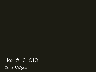 Hex #1c1c13 Color is a almost black yellow color and the nearest color is Rangoon Green #1c1e13. Hex code #1c1c13 and RGB value is rgb(28,28,19). In RGB color space, this color is composed of 11% red, 11% green, 7% blue, In CMYK color space, this color is composed of 0% cyan, 0% magenta, 32% yellow , 89% black , In HSL color space, this color has a hue angle of 60° , 19% saturation and 9% lightness.