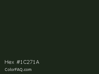 Hex #1c271a Color is a very dark green color and the nearest color is Dark Jungle Green #1a2421. Hex code #1c271a and RGB value is rgb(28,39,26). In RGB color space, this color is composed of 11% red, 15% green, 10% blue, In CMYK color space, this color is composed of 28% cyan, 0% magenta, 33% yellow , 85% black , In HSL color space, this color has a hue angle of 111° , 20% saturation and 13% lightness.