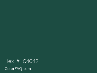 Hex #1c4c42 Color is a very dark cyan color and the nearest color is Brunswick Green #1b4d3e. Hex code #1c4c42 and RGB value is rgb(28,76,66). In RGB color space, this color is composed of 11% red, 30% green, 26% blue, In CMYK color space, this color is composed of 63% cyan, 0% magenta, 13% yellow , 70% black , In HSL color space, this color has a hue angle of 168° , 46% saturation and 20% lightness.