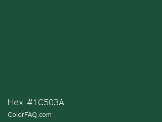 Hex #1c503a Color is a very dark green color and the nearest color is Brunswick Green #1b4d3e. Hex code #1c503a and RGB value is rgb(28,80,58). In RGB color space, this color is composed of 11% red, 31% green, 23% blue, In CMYK color space, this color is composed of 65% cyan, 0% magenta, 28% yellow , 69% black , In HSL color space, this color has a hue angle of 155° , 48% saturation and 21% lightness.