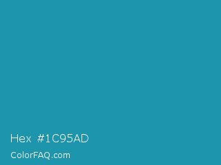 Hex #1c95ad Color is a normal cyan color and the nearest color is Eastern Blue #1e9ab0. Hex code #1c95ad and RGB value is rgb(28,149,173). In RGB color space, this color is composed of 11% red, 58% green, 68% blue, In CMYK color space, this color is composed of 84% cyan, 14% magenta, 0% yellow , 32% black , In HSL color space, this color has a hue angle of 190° , 72% saturation and 39% lightness.