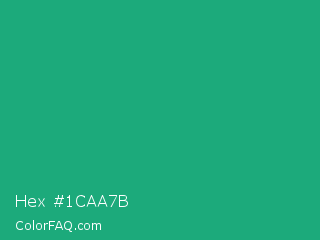 Hex #1caa7b Color is a normal green color and the nearest color is Green Crayola #1cac78. Hex code #1caa7b and RGB value is rgb(28,170,123). In RGB color space, this color is composed of 11% red, 67% green, 48% blue, In CMYK color space, this color is composed of 84% cyan, 0% magenta, 28% yellow , 33% black , In HSL color space, this color has a hue angle of 160° , 72% saturation and 39% lightness.