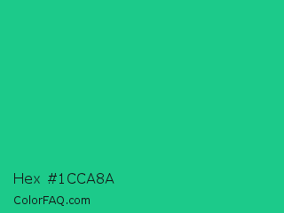 Hex #1cca8a Color is a normal green color and the nearest color is Mountain Meadow Crayola #1ab385. Hex code #1cca8a and RGB value is rgb(28,202,138). In RGB color space, this color is composed of 11% red, 79% green, 54% blue, In CMYK color space, this color is composed of 86% cyan, 0% magenta, 32% yellow , 21% black , In HSL color space, this color has a hue angle of 158° , 76% saturation and 45% lightness.