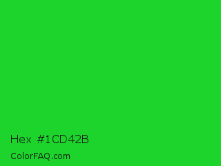 Hex #1cd42b Color is a normal green color and the nearest color is Lime Green #32cd32. Hex code #1cd42b and RGB value is rgb(28,212,43). In RGB color space, this color is composed of 11% red, 83% green, 17% blue, In CMYK color space, this color is composed of 87% cyan, 0% magenta, 80% yellow , 17% black , In HSL color space, this color has a hue angle of 125° , 77% saturation and 47% lightness.