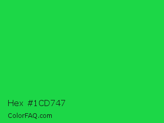 Hex #1cd747 Color is a normal green color and the nearest color is Malachite #0bda51. Hex code #1cd747 and RGB value is rgb(28,215,71). In RGB color space, this color is composed of 11% red, 84% green, 28% blue, In CMYK color space, this color is composed of 87% cyan, 0% magenta, 67% yellow , 16% black , In HSL color space, this color has a hue angle of 134° , 77% saturation and 48% lightness.