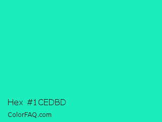 Hex #1cedbd Color is a normal cyan color and the nearest color is Turquoise PWG #30d5c8. Hex code #1cedbd and RGB value is rgb(28,237,189). In RGB color space, this color is composed of 11% red, 93% green, 74% blue, In CMYK color space, this color is composed of 88% cyan, 0% magenta, 20% yellow , 7% black , In HSL color space, this color has a hue angle of 166° , 85% saturation and 52% lightness.