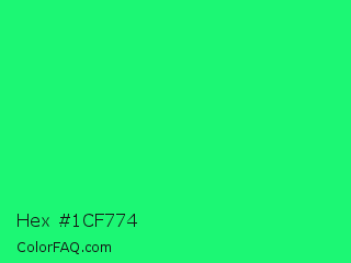 Hex #1cf774 Color is a normal green color and the nearest color is Spring Green #00ff7f. Hex code #1cf774 and RGB value is rgb(28,247,116). In RGB color space, this color is composed of 11% red, 97% green, 45% blue, In CMYK color space, this color is composed of 89% cyan, 0% magenta, 53% yellow , 3% black , In HSL color space, this color has a hue angle of 144° , 93% saturation and 54% lightness.