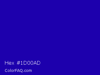 Hex #1d00ad Color is a normal indigo color and the nearest color is Ultramarine #120a8f. Hex code #1d00ad and RGB value is rgb(29,0,173). In RGB color space, this color is composed of 11% red, 0% green, 68% blue, In CMYK color space, this color is composed of 83% cyan, 100% magenta, 0% yellow , 32% black , In HSL color space, this color has a hue angle of 250° , 100% saturation and 34% lightness.