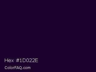 Hex #1d022e Color is a almost black purple color and the nearest color is Haiti #1b1035. Hex code #1d022e and RGB value is rgb(29,2,46). In RGB color space, this color is composed of 11% red, 1% green, 18% blue, In CMYK color space, this color is composed of 37% cyan, 96% magenta, 0% yellow , 82% black , In HSL color space, this color has a hue angle of 277° , 92% saturation and 9% lightness.