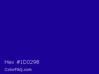 Hex #1d0298 Color is a dark indigo color and the nearest color is Ultramarine #120a8f. Hex code #1d0298 and RGB value is rgb(29,2,152). In RGB color space, this color is composed of 11% red, 1% green, 60% blue, In CMYK color space, this color is composed of 81% cyan, 99% magenta, 0% yellow , 40% black , In HSL color space, this color has a hue angle of 251° , 97% saturation and 30% lightness.