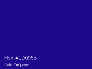 Hex #1d098b Color is a dark indigo color and the nearest color is Ultramarine #120a8f. Hex code #1d098b and RGB value is rgb(29,9,139). In RGB color space, this color is composed of 11% red, 4% green, 55% blue, In CMYK color space, this color is composed of 79% cyan, 94% magenta, 0% yellow , 45% black , In HSL color space, this color has a hue angle of 249° , 88% saturation and 29% lightness.