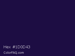 Hex #1d0d43 Color is a very dark indigo color and the nearest color is Violet #240a40. Hex code #1d0d43 and RGB value is rgb(29,13,67). In RGB color space, this color is composed of 11% red, 5% green, 26% blue, In CMYK color space, this color is composed of 57% cyan, 81% magenta, 0% yellow , 74% black , In HSL color space, this color has a hue angle of 258° , 68% saturation and 16% lightness.