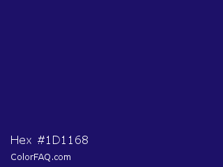 Hex #1d1168 Color is a dark indigo color and the nearest color is Lucky Point #1a1a68. Hex code #1d1168 and RGB value is rgb(29,17,104). In RGB color space, this color is composed of 11% red, 7% green, 41% blue, In CMYK color space, this color is composed of 72% cyan, 84% magenta, 0% yellow , 59% black , In HSL color space, this color has a hue angle of 248° , 72% saturation and 24% lightness.