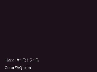 Hex #1d121b Color is a almost black magenta color and the nearest color is Eerie Black #1b1b1b. Hex code #1d121b and RGB value is rgb(29,18,27). In RGB color space, this color is composed of 11% red, 7% green, 11% blue, In CMYK color space, this color is composed of 0% cyan, 38% magenta, 7% yellow , 89% black , In HSL color space, this color has a hue angle of 311° , 23% saturation and 9% lightness.