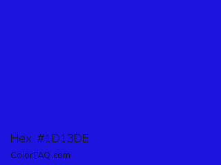 Hex #1d13de Color is a normal indigo color and the nearest color is Bluebonnet #1c1cf0. Hex code #1d13de and RGB value is rgb(29,19,222). In RGB color space, this color is composed of 11% red, 7% green, 87% blue, In CMYK color space, this color is composed of 87% cyan, 91% magenta, 0% yellow , 13% black , In HSL color space, this color has a hue angle of 243° , 84% saturation and 47% lightness.