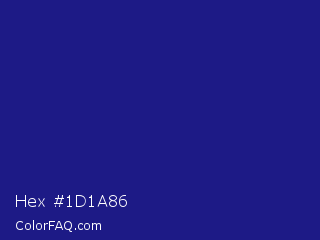 Hex #1d1a86 Color is a normal indigo color and the nearest color is Jacksons Purple #20208d. Hex code #1d1a86 and RGB value is rgb(29,26,134). In RGB color space, this color is composed of 11% red, 10% green, 53% blue, In CMYK color space, this color is composed of 78% cyan, 81% magenta, 0% yellow , 47% black , In HSL color space, this color has a hue angle of 242° , 68% saturation and 31% lightness.