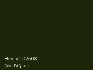 Hex #1d2608 Color is a almost black lime color and the nearest color is Deep Forest Green #182d09. Hex code #1d2608 and RGB value is rgb(29,38,8). In RGB color space, this color is composed of 11% red, 15% green, 3% blue, In CMYK color space, this color is composed of 24% cyan, 0% magenta, 79% yellow , 85% black , In HSL color space, this color has a hue angle of 78° , 65% saturation and 9% lightness.