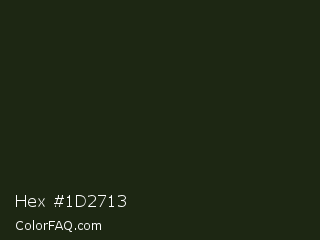 Hex #1d2713 Color is a very dark green color and the nearest color is Seaweed #1b2f11. Hex code #1d2713 and RGB value is rgb(29,39,19). In RGB color space, this color is composed of 11% red, 15% green, 7% blue, In CMYK color space, this color is composed of 26% cyan, 0% magenta, 51% yellow , 85% black , In HSL color space, this color has a hue angle of 90° , 34% saturation and 11% lightness.
