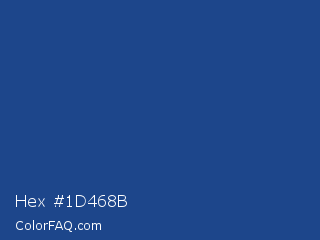 Hex #1d468b Color is a normal blue color and the nearest color is Yale Blue #0f4d92. Hex code #1d468b and RGB value is rgb(29,70,139). In RGB color space, this color is composed of 11% red, 27% green, 55% blue, In CMYK color space, this color is composed of 79% cyan, 50% magenta, 0% yellow , 45% black , In HSL color space, this color has a hue angle of 218° , 65% saturation and 33% lightness.
